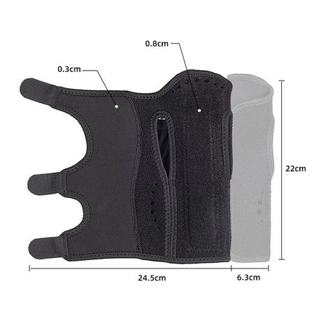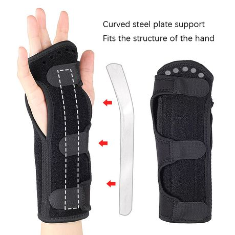 This steel plate wrist and palm support immobilizes and protects the wrist following tendonitis and other soft tissue injuries such as sprains/strains, and post-trauma healing.